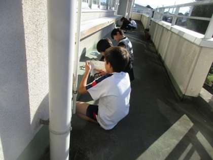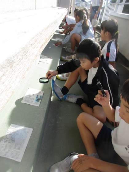 虫めがねで日光を集める実験をしました。太陽に虫めがねのレンズを向け、できた明るい円をできるだけ小さくしました。焦げ臭いにおいがしました。