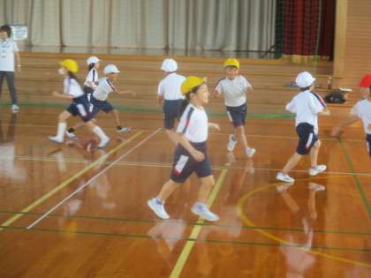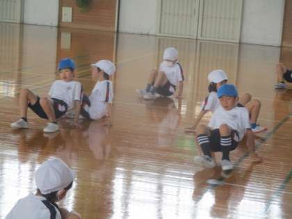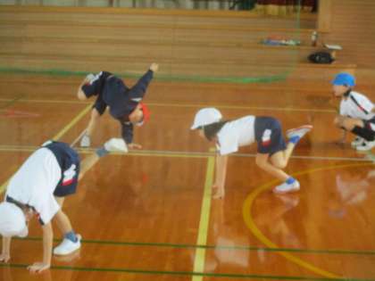 スポーツ指導員派遣事業として2名の先生をお招きし、マット運動をしました。準備運動では、ストップアンドゴーを行い、先生の「ストップ」の掛け声で動きを止めたり、体幹を使うようなポーズをしたりしました。