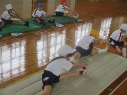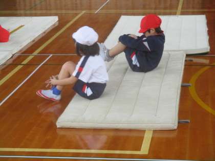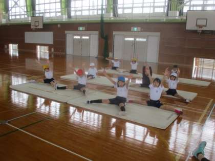 マットの上でストレッチを行いました。ゆりかごの動きから立ち上がる動きが上手にできました。