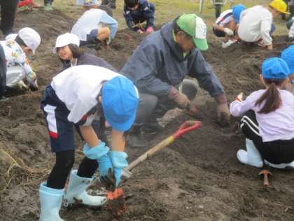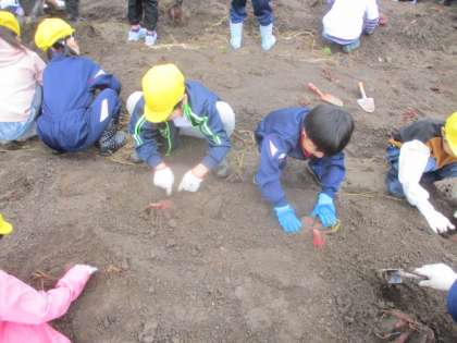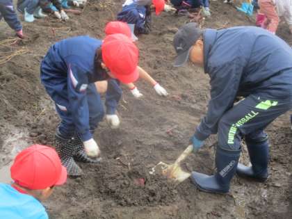 老人クラブの方と1年生と一緒に、サツマイモの収穫をしました。畑を掘ると、大きなサツマイモがたくさん出てきました。イモが深くて掘るのが難しいところは、老人クラブの方に手伝っていただきました。