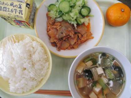 11月11日(月) 今日の給食 公開日 2024/11/11 更新日 2024/11/11 今日の給食 今日の献立は、ごはん、豚肉とレバーのケチャップソース炒め、そえ野菜、すまし汁、みかん、牛乳です。 豚肉とレバーは子供たちが大好きなケチャップで味つけられています。すまし汁は、具材がやわらかく味がしみ、食べやすくなっています。今日はデザートにみかんがついています。 今日もおいしくいただきました!