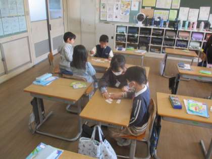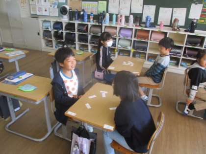 【2年生】九九の練習をがんばっています 公開日 2024/11/12 更新日 2024/11/12 2年生 算数では、2の段〜5の段の九九まで学習しました。今日は、5の段の九九カードを使って、かるたをしながら練習しました。友達と何枚のカードが取れたか競いながら、楽しく九九を覚えていました。子供たちは「他の九九カードも混ぜてやりたい」「次はもっとたくさんのカードを取りたい」とやる気をみせていました。
