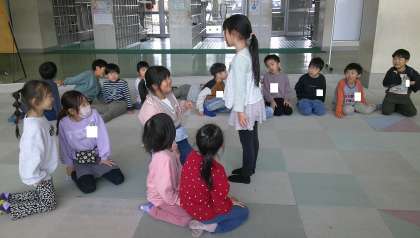 誰にでも声をかけ、仲良く遊ぶことができるように「一緒に遊ぼうゲーム」を行いました。最初に大切なポイントを確認しました。