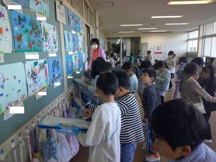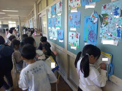 図画工作科で、友達の作品を見て、すてきなところや工夫してあるなと思うところを見付ける学習を行いました。「魚がお話しているみたい」「色を混ぜたり、光る紙を貼ったりするのを工夫している」など、自分なりに見付けたことを友達に伝えていました。