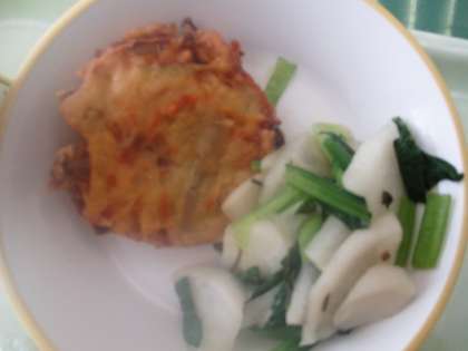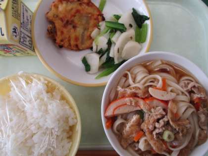 今日は2回目の「学校給食とやまの日」です。献立は、ごはん、野菜かき揚げうどん(かき揚げ・かやくうどん)、やちゃら、牛乳です。
