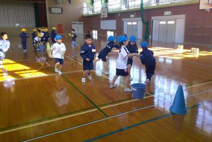 体育科で、的をねらって玉を投げる学習を行いました。この後、お互いに投げ合って的を移動させるゲームに取り組む予定です。