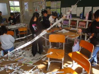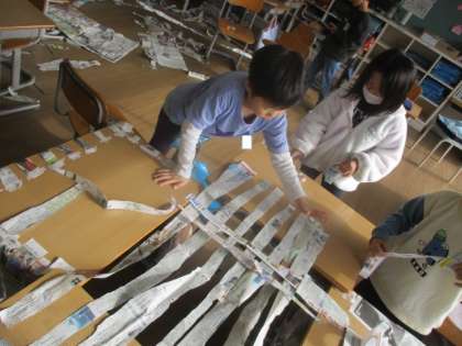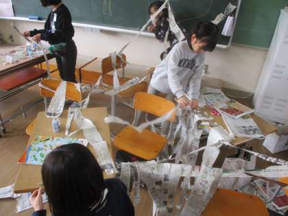 図工では、いろいろな紙を使って造形遊びをしました。細長く切った紙を繋いだり、繋いだ紙や壁からつるしたりしました。友達と相談しながら楽しく活動することができました。