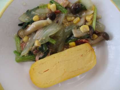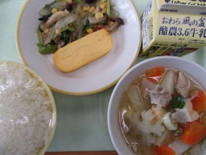 12月3日(火) 今日の給食 公開日 2024/12/03 更新日 2024/12/03 今日の給食 今日の献立は、ごはん、厚焼きたまご、野菜のオイスターソース炒め、豚汁、牛乳です。 豚汁は、しょうがと味噌の風味がよく、具だくさんでした。 野菜のオイスターソース炒めは、しめじや玉ねぎ、小松菜などの野菜にこくのある味つけがしてあり、ごはんが進む一品でした。 今日もおいしくいただきました!