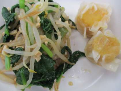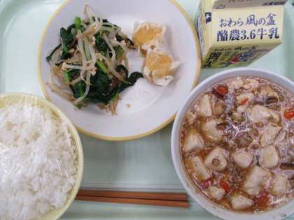 今日の献立は、ごはん、にんじんシューマイ、小松菜の大豆そぼろ和え、マーボー豆腐、牛乳です。