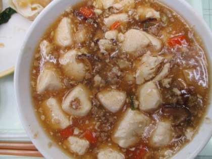マーボー豆腐は、旨みの中に少し辛さがあります。給食のマーボー豆腐は一番おいしいと思います。小松菜は大豆をくだいてそぼろ状にしたものであえています。