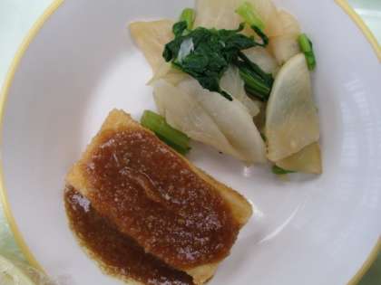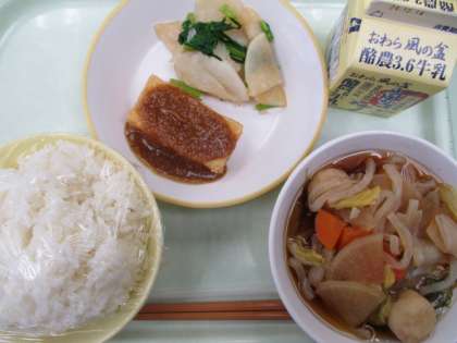 12月9日(月) 今日の給食 公開日 2024/12/09 更新日 2024/12/09 今日の給食 今日の献立は、ごはん、揚げ出し豆腐のごまだれかけ、かぶの色どり、冬野菜鍋、牛乳です。 冬野菜鍋には、白菜や大根、ニンジンなどの野菜とつみれ、こんにゃく等の具がよく煮込まれていました。食べると体もほかほかになりました。揚げ出し豆腐にかかっているごまだれは風味よく、甘塩っぱく、ごはんによく合いました。 今日もおいしくいただきました!