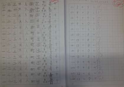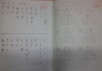 今週は、算数や国語の学習に取り組んでいる人が多かったです。算数では、たし算やひき算に加えて、文章問題や計算ピラミッド、国語では漢字が圧倒的に多かったようです。そんな中で、好きな絵を描いている人もいました。絵を描くときは、周りを空けずに1ページをうめられるとよいですね。