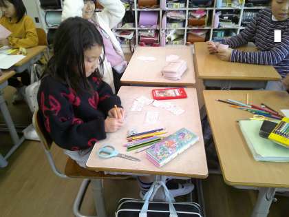 ソーシャルスキルトレーニングとして、友達のよいところを見つけてカードに書き、プレゼントする活動を行いました。きれいな字で書いたり、色塗りをするなど丁寧に仕上げていました。その後、直接友達のもとに行き、カードに書いたことを声に出し伝え合い、少し照れくさそうにしながらも笑顔が溢れる時間となりました。もらったカードは台紙に貼り、飾り付けをするなど、大切に保管していました。