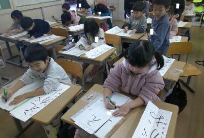 書き初め「えがお」の練習を、文字の中心に気を付けながら行いました。力強く書くために、立って書く子もいました。