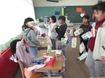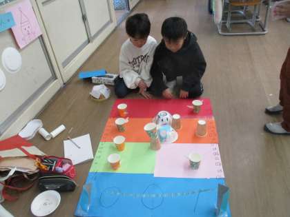 自分たちが作った動くおもちゃで遊びました。看板を作ったり、的当ての準備をしたり、コースづくりをしたりと、協力して遊ぶ準備をしました。