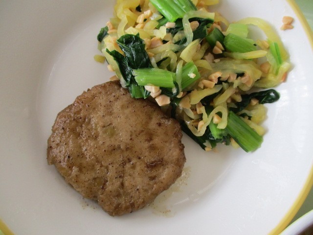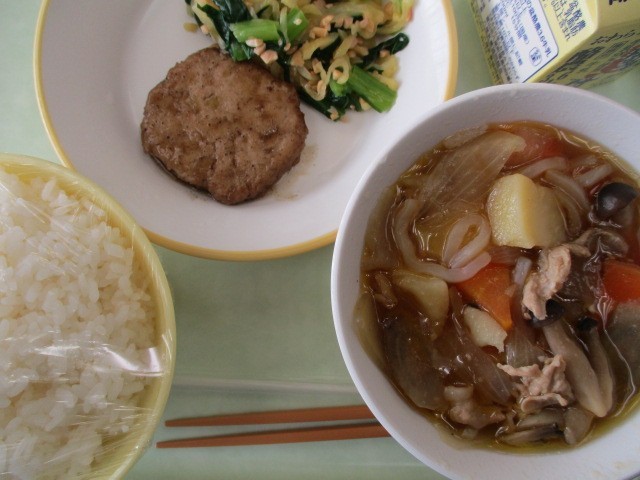 今日の献立は、ごはん、鶏つくね、納豆和え、豚肉の南蛮煮、牛乳です。