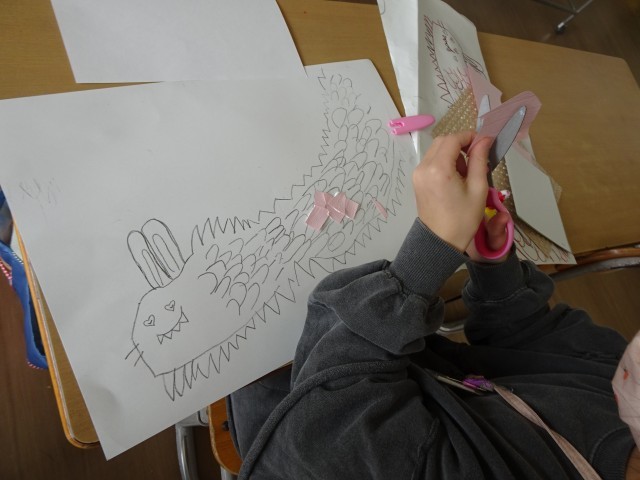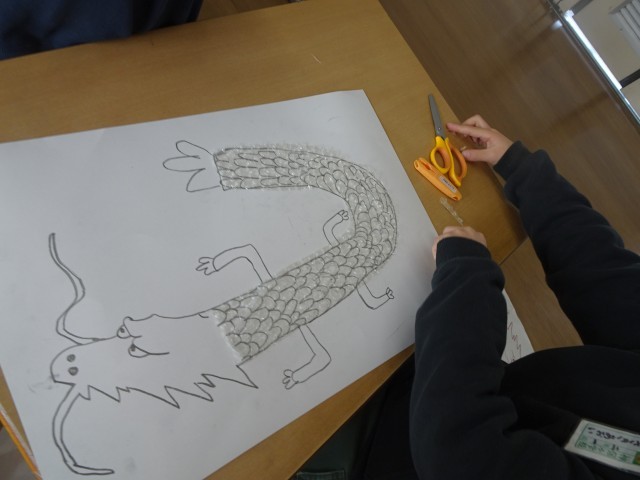 3学期の図画工作科では、紙はんがに取り組んでいます。「龍」をテーマに下絵を描き、自分のイメージに合わせて、いろいろな模様の紙を貼っていきます。初めは不安そうだった子供たちも、だんだん楽しそうに作業を進めています。