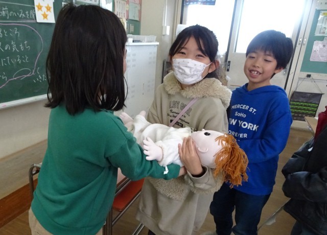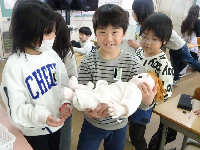 その後、生まれたときの赤ちゃんと同じくらいの大きさ・重さの人形を抱いてみました。「うわっ、重たい」「大きいね」などという声が聞かれました。
