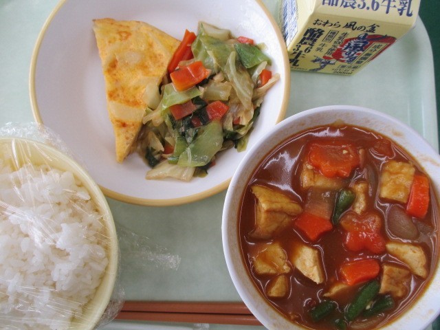 今日の献立は、ごはん、スパニッシュオムレツ、黄金比の野菜炒め、厚揚げのカレー味、牛乳です。