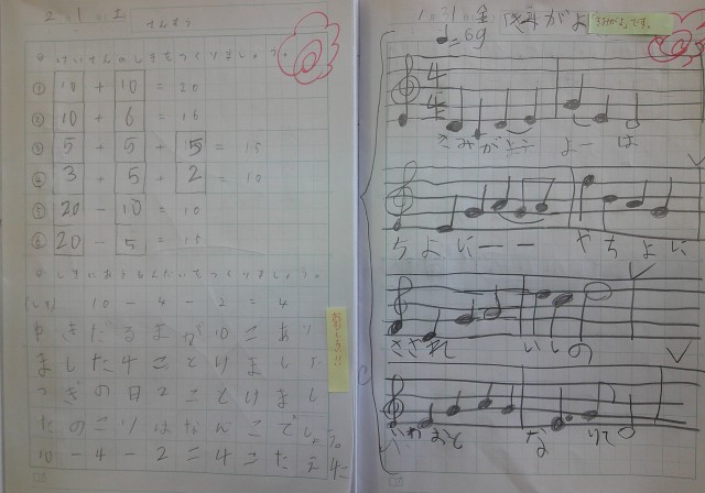 1年生 自主学習がんばっています26 公開日 2025/02/04 更新日 2025/02/03 1年生 今回提出した自学では、2日に公民館で行われた冬の文化祭についての日記や今勉強していることを書いたものがありました。また、少し前から卒業式で歌う歌の練習を始めていますが、その楽譜を書いたり、学んだことを自分なりに工夫して書いたものもありました。それぞれの子供たちが、自分が興味をもったものに取り組んでいるのは素晴らしいことですね。