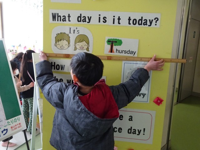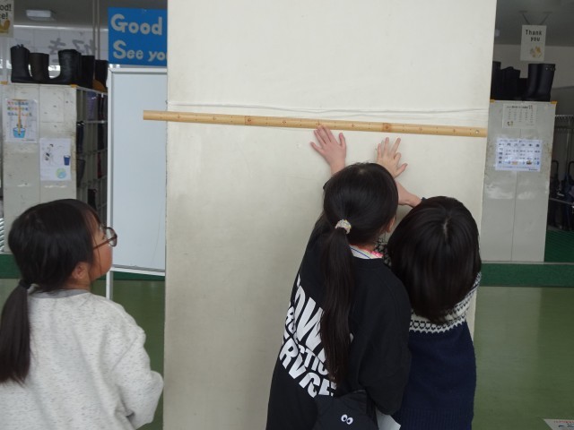 長さの学習で「1m」の単位を学びました。今日は、「1mのものをみつけよう」と教室の中や廊下・多目的スペース等で探すといろいろなものが見つかり、「1m」の量感も養われました。