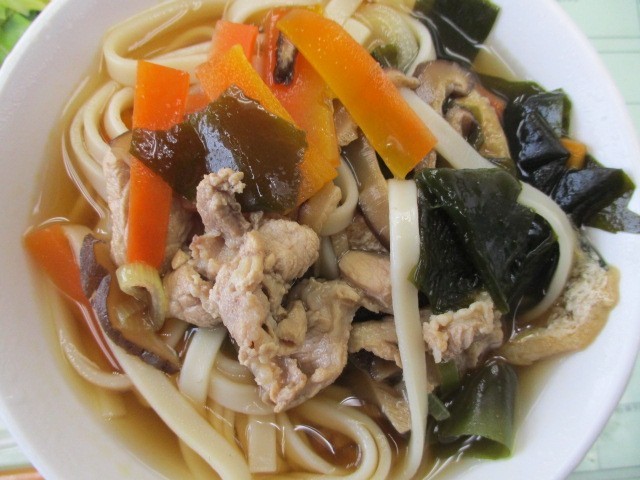 五目うどんは、具たっぷりの温かいうどんです。厚焼きたまごは甘じょっぱい味付けです。