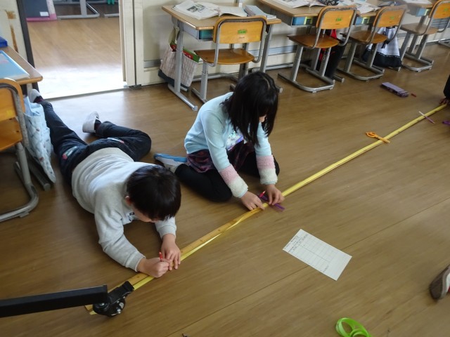 1mものさしを使って、紙テープで3mものさしをつくり、長いものの長さをはかってみました。