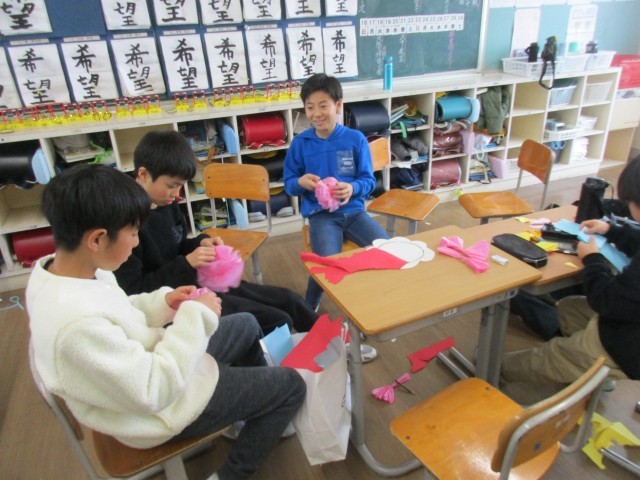 5年生 卒業を盛り上げようプロジェクト 公開日 2025/02/18 更新日 2025/02/18 5年生 5年生は、6年生のために、2つのグループに分かれて活動しています。「環境」チームは、すてきな飾りを作っています。
