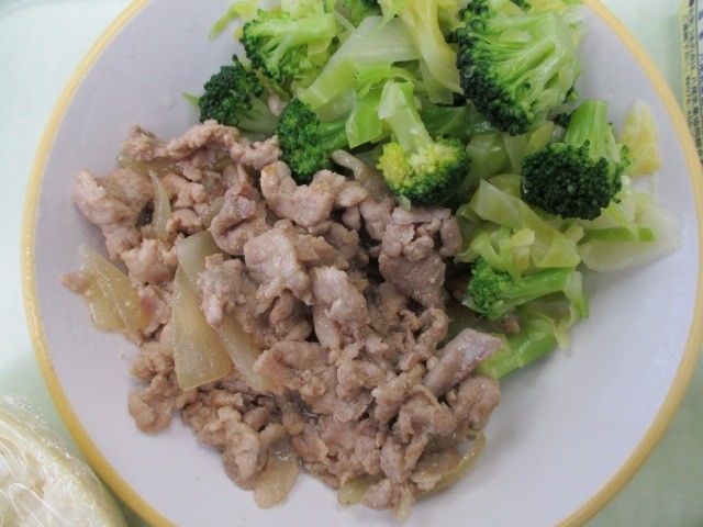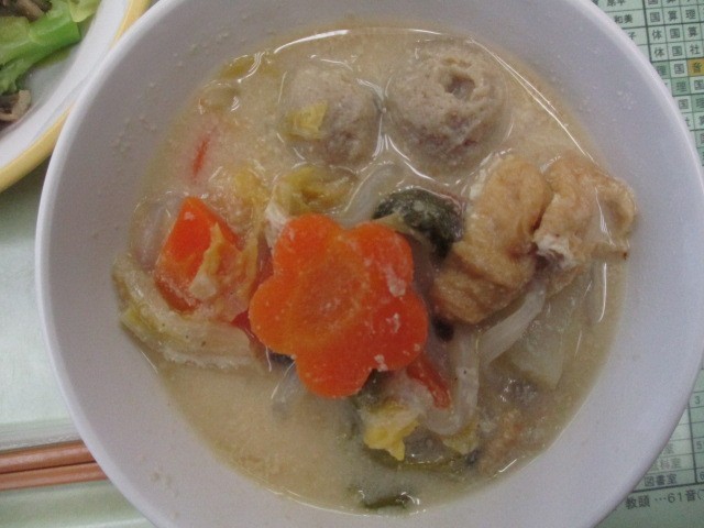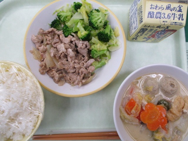 今日の献立は、ごはん、豚肉の塩こうじ炒め、そえ野菜、ごま豆乳鍋、牛乳です。