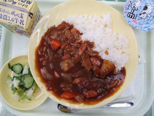 今日の献立は、食べキリンハヤシ(ごはん)、白菜サラダ、ヨーグルト、牛乳です。