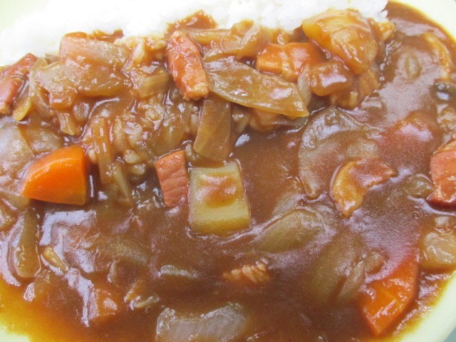 ハヤシライスには、ベーコンやしめじ、にんじんが入っています。いつものおいしさです。
