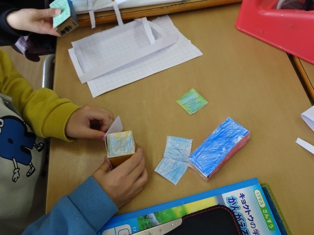 さいころの形は全部正方形でできており、ティッシュ箱の形では、長方形が組み合わさっていることを実感していました。