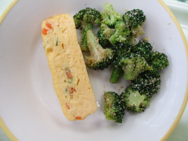 今日の献立は、ごはん、千草焼き、ブロッコリーのごまだれ、韓国風すきやき、清見オレンジ、牛乳です。