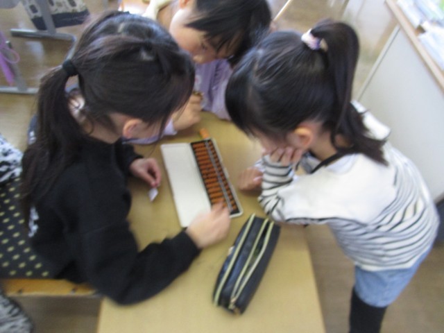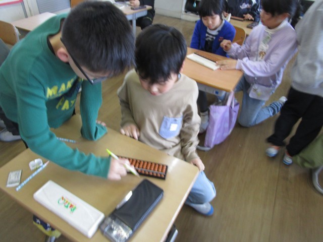 3年生の算数科ではそろばんの学習を行いました。そろばんを使って数を表したり、簡単な計算をしたりすることができました。初めて使う子供が多いなか、互いに使い方を教えながら学習を進めている子供たちです。