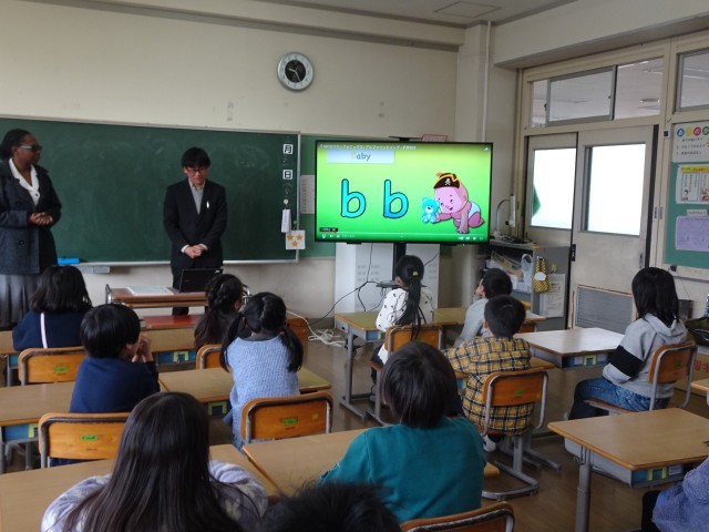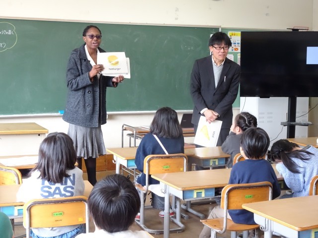 絵カードを見て、ALTの先生のまねをして発音したり、アルファベットの歌を歌ったり、線つなぎや間違い探しなどのプリントに挑戦したりしました。楽しい時間を過ごし、3年生への期待が高まったようです。