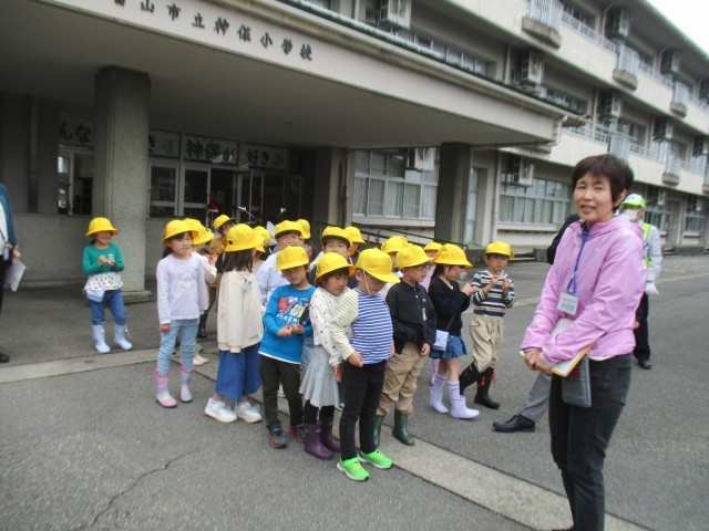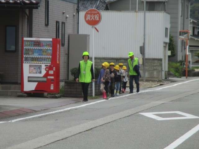 お話を聞いた後、グループに分かれ、地域の方や先生方と一緒に、実際に公道を歩きました。