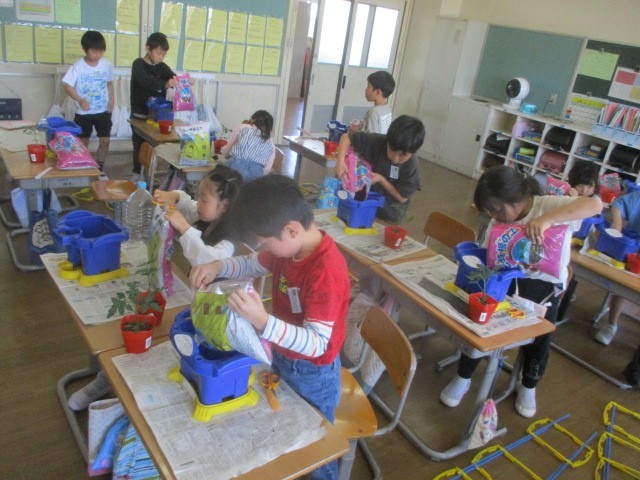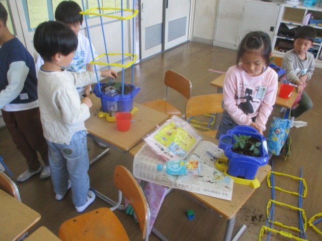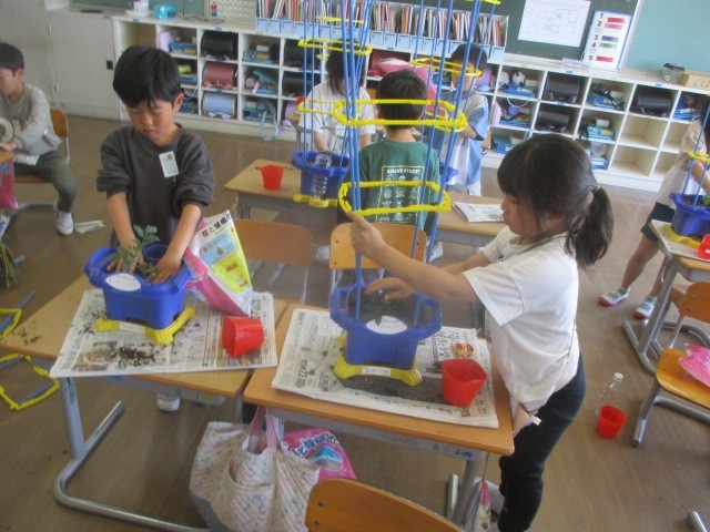 生活科の学習で、ミニトマトの苗を植えました。友達と協力して鉢に土を入れたり支柱を立てたりする子供や「大きくなったらアブラムシが付くんだって」「実がなったら鳥が食べに来るよ」など、家の人から教わったことを友達にアドバイスする子供の姿が見られました。ミニトマトの生長を楽しみに、張り切ってお世話をしていました。