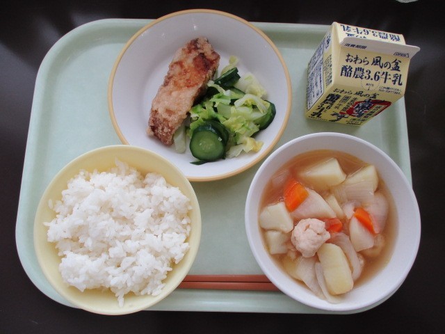 5月12日(月)の給食 公開日 2025/05/12 更新日 2025/05/12 今日の給食 今日の献立は、ごはん、牛乳、あじのから揚げ、きざみ和え、和風ポトフです。和風ポトフは、ほくほくのじゃがいもに、たっぷりとだしがしみこんでいて、食べ応えがありました。