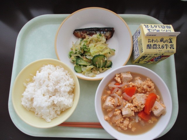 今日の献立は、ぎはん、いわしの生姜味、合わせ和え、豆腐の錦とじ、牛乳です。