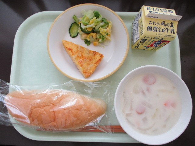 5月16日(金)の給食 公開日 2025/05/16 更新日 2025/05/16 今日の給食 今日の献立は、コッペパン、スパニッシュオムレツ、コーンサラダ、クリームスープ、牛乳です。クリームスープは、子供たちが大好きなメニューの一つです。たっぷりの具が入った味わいのあるスープで、午後からの力を蓄えました。
