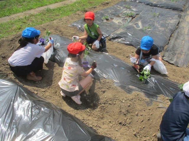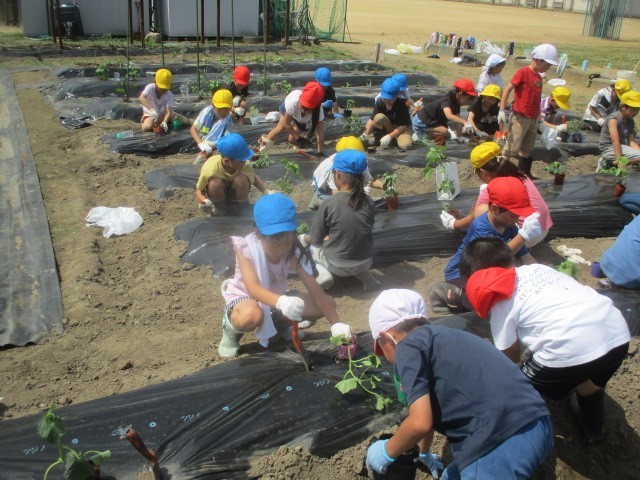 生活科の学習で、自分で育てたい野菜を決めて畑に植えました。子供たちは「大きくて元気な苗を選んだよ」「葉っぱの色が濃い緑の苗にしたよ」など、お店で選んだときのポイントを教えてくれました。苗に水やりをしながら、大きな実が実ることを楽しみにしている様子でした。
