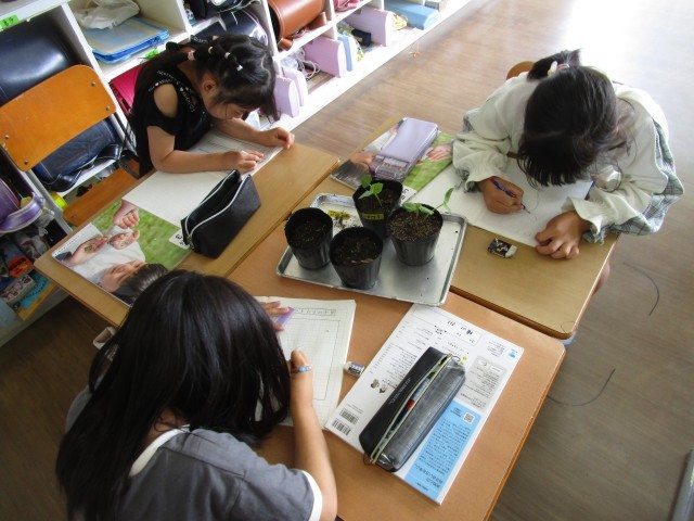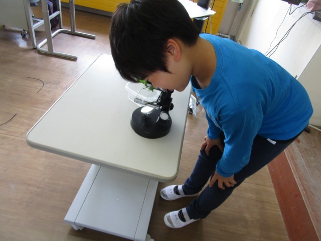 3年生では理科の学習で植物や昆虫の育ち方を学習しています。ホウセンカやピーマン、オクラ、ヒマワリの種から観察し、今日は子葉を観察しました。手触りを比べて、違いを感じ取ったり、葉っぱの数が同じであることを捉えたりしています。また、同時に今日はモンシロチョウの卵を観察しました。キャベツの葉についた卵を顕微鏡で見て、とても小さな卵にも、しっかりと模様があることに驚いていました。