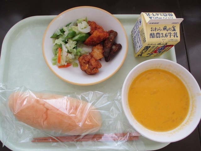 5月30日(金)の給食 公開日 2025/05/30 更新日 2025/05/30 今日の給食 今日の献立は、コッペパン、鶏肉とレバーのカレー風味、イタリアンサラダ、かぼちゃポタージュ、牛乳です。レバーがとてもおいしく味付けしてあり、子供たちにも好評でした。
