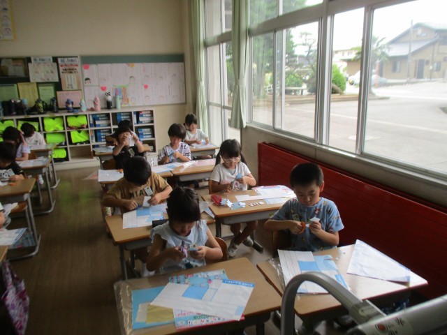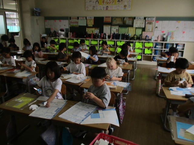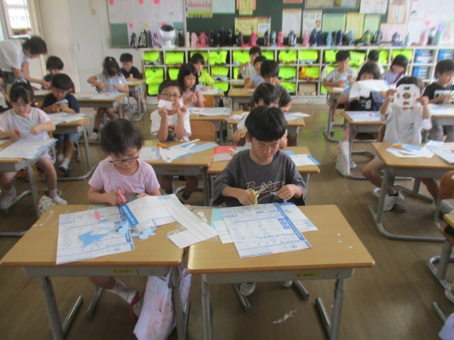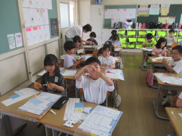1年生 図画工作科「ちょきちょきかざり」では、紙を折って切り取った形を材料にして、飾りをつくります。