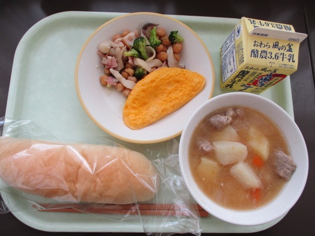 今日の献立は、コッペパン、オムレツ、きのこと豆のアヒージョ、ポトフ、牛乳です。