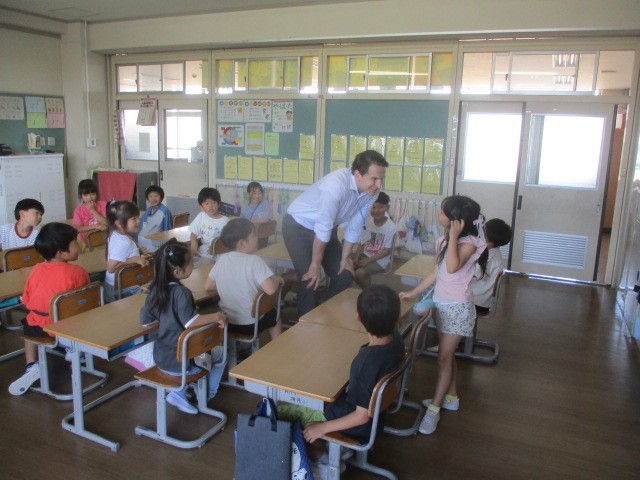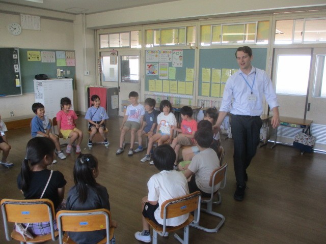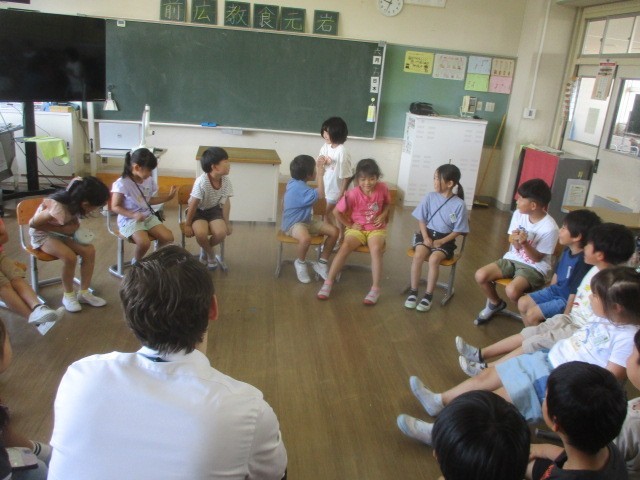 外国語活動で、ALTの先生とあいさつをしたり、一緒にゲームをしたりしました。「ハンカチおとし」に似たルールの遊びもあり、みんなで楽しみました。
