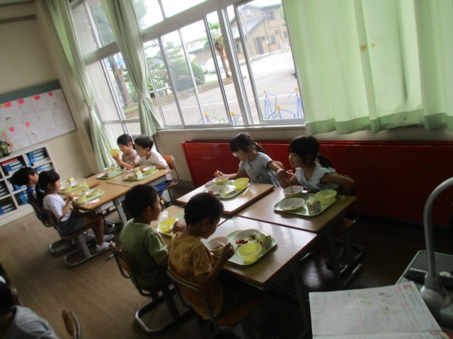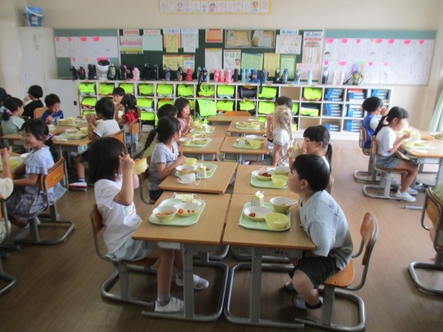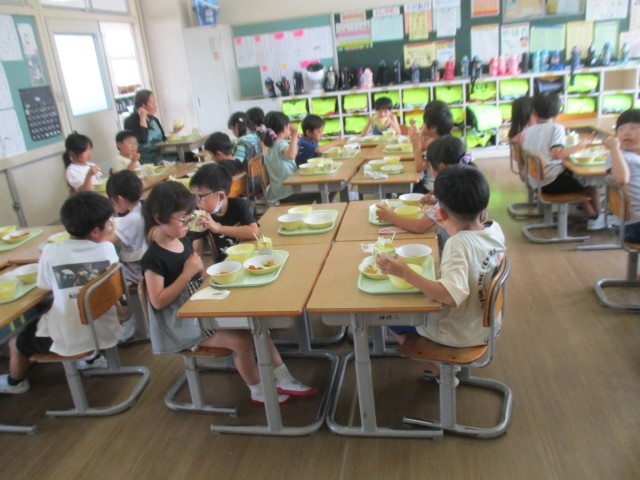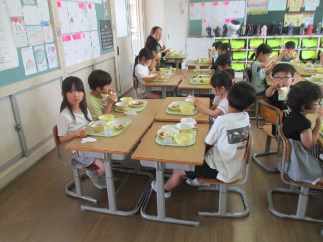 1年生は、今回、初めて4人グループでの給食を試してみました。これまでよりも、教室が広く使える利点があります。
