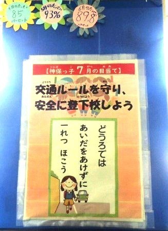 7月の神保っ子の目当て 公開日 2025/07/04 更新日 2025/07/03 お知らせ・お願い 7月の神保っ子の目当ては「交通ルールを守り、安全に登下校しよう」です。毎日の集団登校から、安全に登校できるように意識していきます。また、日頃より神保っ子の安全を見守ってくださる地域の皆様、見守り隊の皆様ありがとうございます。