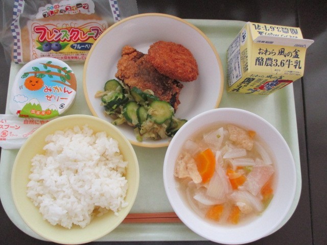 7月10日(木)の給食 公開日 2025/07/10 更新日 2025/07/10 今日の給食 今日の献立は、ごはん、◆ホキの竜田揚げ、◆メンチカツ、おひたし、具だくさん汁、〇みかんゼリー、〇グルーベリークレープ、牛乳です。 今日は、選択献立です。自分で選んだメニューを食べることができる日とあって、子供たちは朝から給食の時間を心待ちにしています。