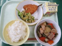 今日の献立は、ごはん、あじフライ、昆布和え、関東だき、牛乳です。関東だきは、かつ...